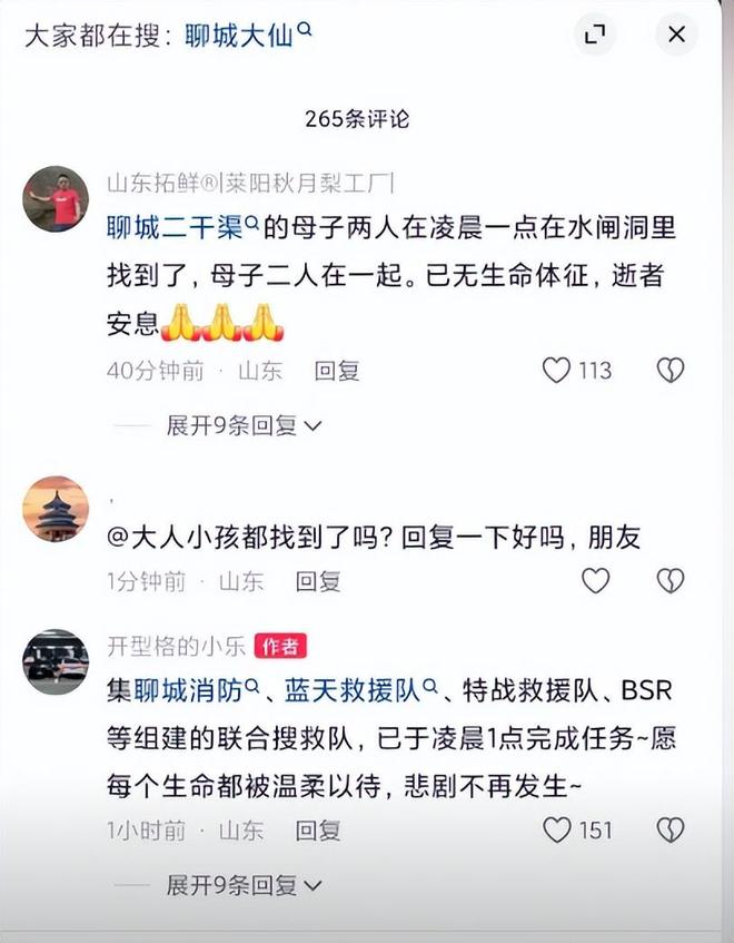 但现实是残酷的,22日一大早,有坚守现场的网友发声,在100多人专业救援力量努力下,聊城跳河轻生母子终于被找到了。只可惜的是!找这对母子早失去了生命生命。